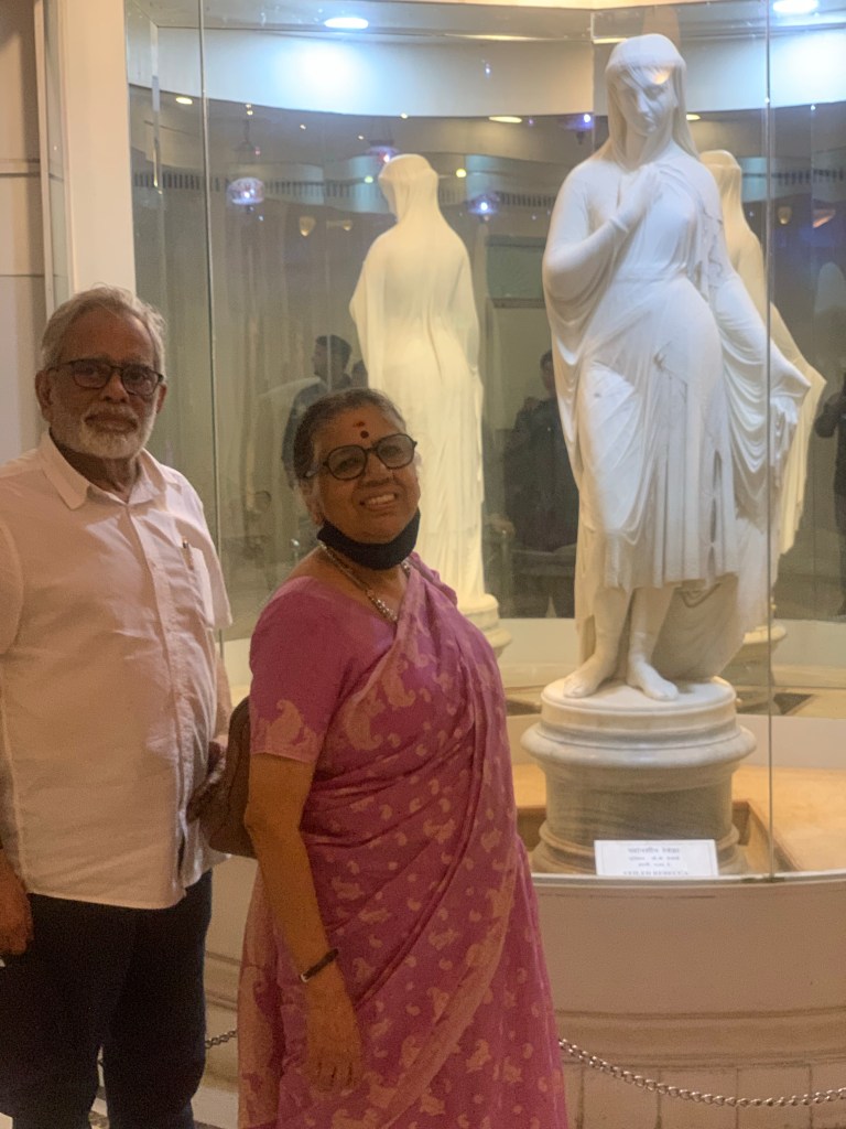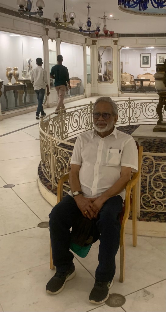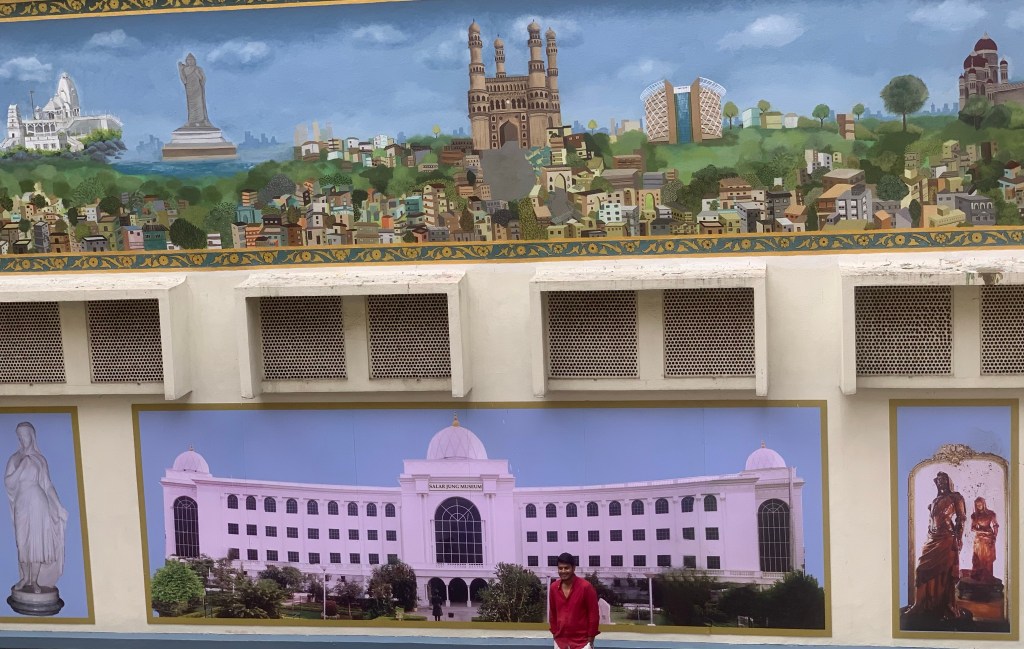 The Hotel was about a hundred years old and one of the good vegetarian restaurants, situated in the heart of the city. My friend was waiting to receive us in the hotel. We did not waste any time and went straight to the hotel. After our lunch, as planned, we went to the Salar Jung Art Museum, located on the southern bank of the Musi River in Hyderabad, which fortunately was not very far from the hotel. The museum was not having the old ceremonial elegance and splendor, many of the rooms were closed for repair/renovation/ maintenance/empty though I must confess it was well maintained. We spent a lot of time going through some of the very old and exquisite pieces of crockery, furniture, clocks, beautiful lighting, wall hangings, paintings and so on. It was interesting to note how some staff was following us right through. I was worried whether I did anything against their protocol. So when we were finishing the visit, one of them walked over and asked if I was related to the PM. That was the reason they followed us., waiting to assist us in case we needed help. When I replied negatively they wanted to stand with us for a photograph. When my wife too wanted to join the session, they wanted a solo one with me and then a group one. As I had another experience like this at the Kedarnath yatra, a year ago, it was not a complete surprise to me. Anyway, it was indeed a pleasant time.
